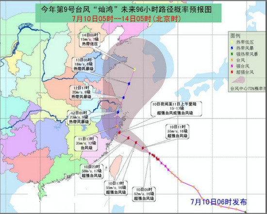 昨晚23时,浙江省气象台发布超强台风警报。浙江省防指将防汛防台风应急响应等级已提升为Ⅲ级。“灿鸿”过去3小时向西北方向移动了约70公里。预计“灿鸿”将以每小时25公里左右的速度向西北偏西方向移动。10日将进入东海东部海域,然后逐渐向浙江沿海靠近,最大可能于10日后半夜到11日中午在瑞安到象山一带沿海登陆,登陆时强度可达强台风级到超强台风级。