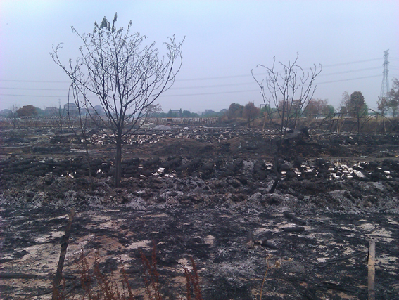 27日10点左右,我们来到事发地,我们看到的是剩下几个破旧的帐篷,一大片黑色的田野,还有就是灾民们眼里无尽的惆怅与求助的渴望。虽然火灾过去数日,但仍可闻道很浓的刺鼻的烧焦味。
