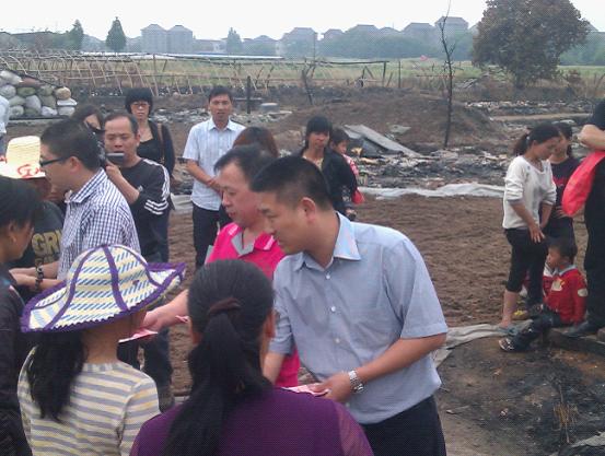 5月26日,杭州湖南商会得知杭州余杭区良渚镇行宫塘村有湖南人发生火灾,高度重视,马上组织慰问小组。第二日,商会副会长黄华、黄勇、张林华,会员刘中平、文雯,办公室主任高宇一行共计10人前往看望受灾菇农。当天和我商会一起前往的还有杭州生活频道《我和你说》栏目的记者,他们之前以对此事进行报道,这次是进行进一步的跟踪。