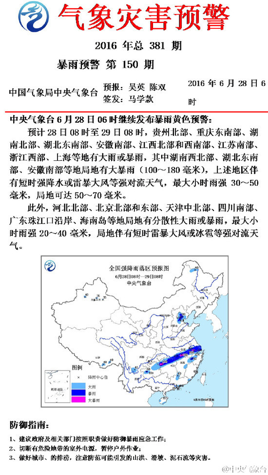 受低涡切变系统影响,预计28日至29日,贵州北部、重庆东南部、湖南北部、湖北东南部、江西北部和西南部、苏皖南部、浙江西部、上海等地有大雨或暴雨,其中湖南西北部、湖北东南部、安徽南部等地局地有大暴雨(100~180毫米),上述地区伴有短时强降水或雷暴大风等强对流天气,最大小时雨强30~50毫米,局地可达50~70毫米。为此,中央气象台6月28日06时继续发布暴雨黄色预警。
